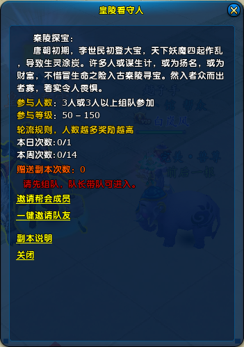 秦陵副本需50-150级玩家3人或以上组队才能参加。