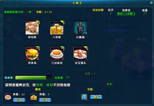 4. 吃菜品会增加饱食度,饱食度每秒会降低少许,当饱食度满的时候,短时间内不能吃食物,反胃饱食度降低,但是食量也会大量减少。