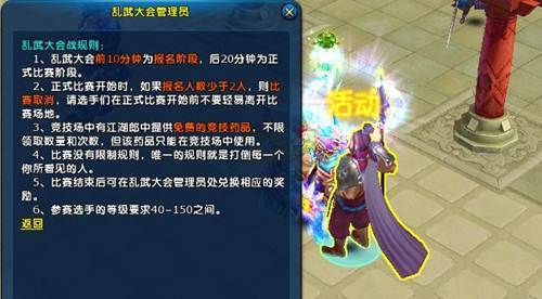 比赛结束后,根据击杀敌人数量在乱武大会管理员NPC处领取高额奖励。