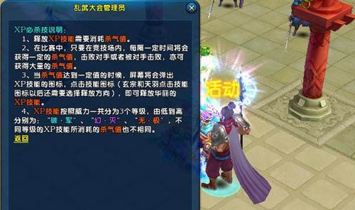 乱武大会除了专用药水外,还会为玩家提供专用的XP必杀技。玩家使用XP必杀技需要消耗杀气值。在比赛中,只要处于竞技场内,每隔一段时间都会获得杀气值,如果击败对手或被对手击败,都将获得大量杀气值。当杀气值达到技能要求,则屏幕中央会自动出现善良的XP必杀技图标。点击即可释放。XP必杀技从低到高分为“破·军”、“幻·灭”以及“无·极”,不同的必杀技所需杀气值不同。