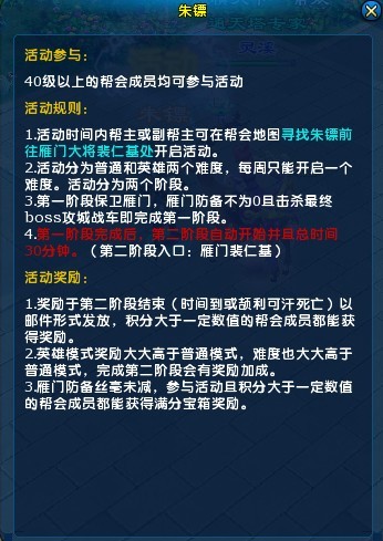 1. 当帮会成员都成功传入地图后,帮主或副帮主可在NPC大将裴仁基处开启活动。每个活动周只能开启一次活动,活动分两种难度:普通难度和英雄难度。
