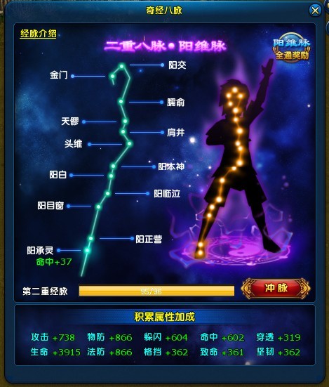 当奇经八脉全部288个穴位打通后你的人物就可攻防兼备立于不败之地了。