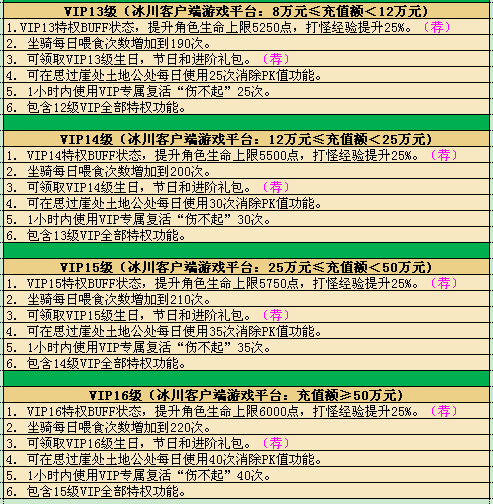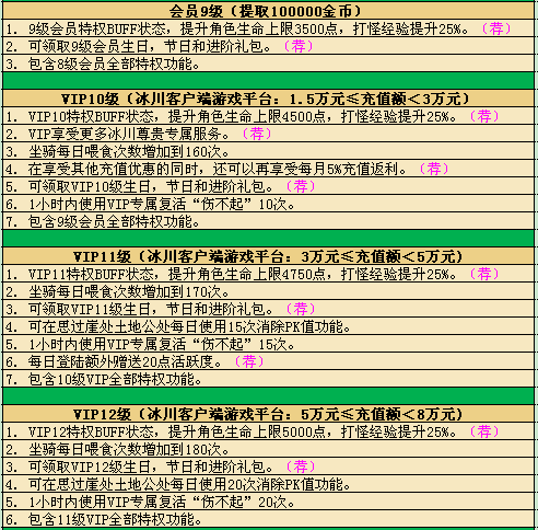 2、凡是在冰川通行证(包括远征)客户端游戏进行过充值的账号,一旦累积充值人民币金额达到15000元,即可获得终身永久VIP10,VIP10以上的账号对所有角色有效。