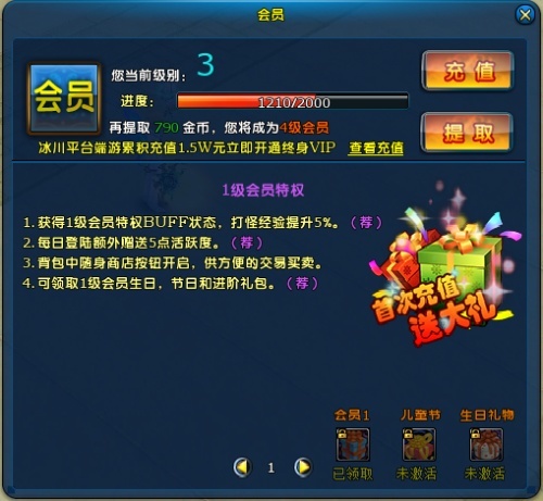 1、充值以后,提取相应数量的金币到指定角色上,即可获得会员等级的提升,对该角色有效。