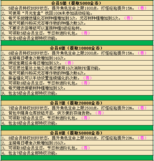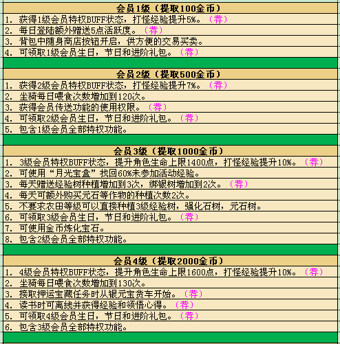 玩家往账号充值金币,提取对应的金币数量免费获得不同等级的会员特权,最低十元,就可享受多项会员特权!随身商店、每天额外活跃度、打怪经验加成、属性加成等多项会员特权,让你游戏乐翻天!