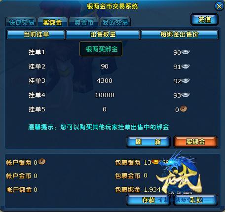 买绑金:所有玩家寄售的金币都会成为绑定金币,玩家可使用非绑定银币买入。