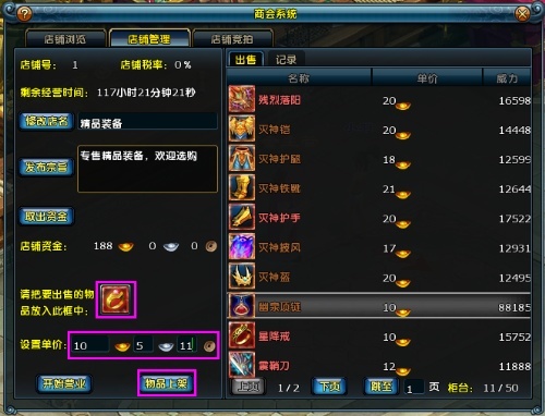 要出售物品时,可以将物品放入物品框中,输入单价,再点击“物品上架”即可完成上架操作。