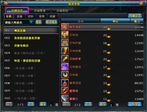 玩家可以浏览各家店铺,寻找满意的商品,选中该商品后,点击界面右下的“购买”按键,进行购买。
