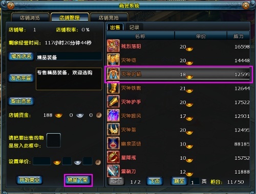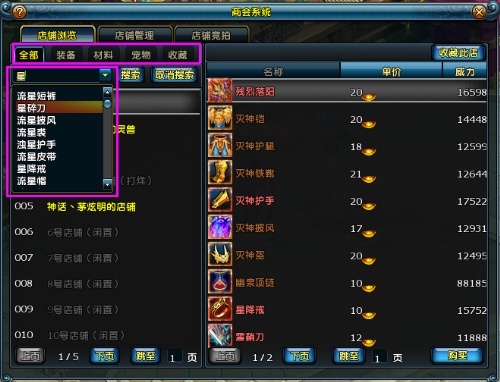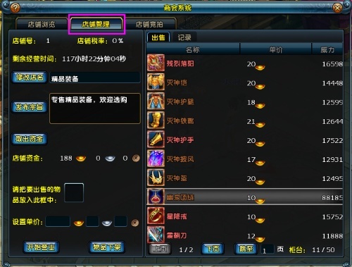游戏目前有店铺50家,为1到50号店铺,系统每周将对所有店铺进行经营权竞拍,竞拍成功的玩家拥有该店铺经营权一周,每个角色最多只可拥有一家店铺。