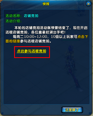 在每周二10:00到12:00,玩家还可以远程参与店铺竞拍。点击活动追踪里的“店铺远程竞拍”链接, 在打开的界面中点击参与链接,即可打开竞拍界面。