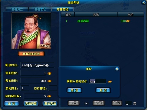 玩家可以点击“出价”按键,输入价格进行竞拍,也可以点击“竞拍托管”按键,输入保证金和目标排名,由系统自己帮助竞拍。