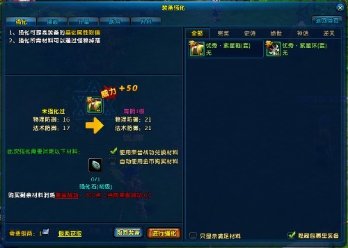 强化可极大的提高装备的基础攻击力和防御力,强化过程需要使用相应的材料晶石——强化石,强化装备不要求必须有属性或有插槽。