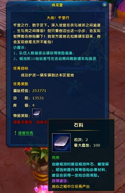 2. 镖车可被拦截,如镖车被毁坏,则所得奖励会降低20%;
