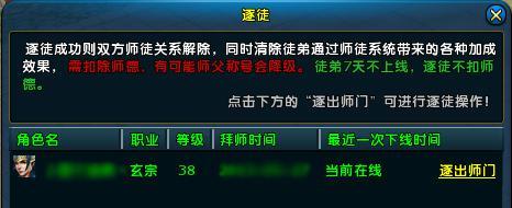 作为师父的你,如果对徒弟的表现不满意,可以将其逐出师门。到长安找师徒管理员(长安48,26),与师团管理员对话,选择“我要逐徒”;