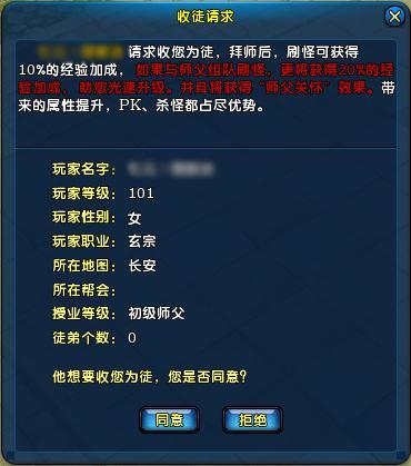 准师父操作完成时,你将会收到确认对话框,点击“同意”按钮,拜师就完成啦,赶紧让师父带你升级吧!