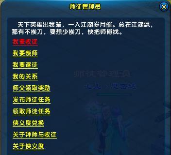 2. 师父每天可以给徒弟发布师徒任务,徒弟每次完成任务后,徒弟可获得经验和金钱,师父可获得侠义度和师德(用于提升授业等级);