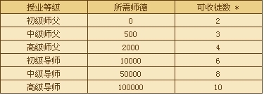 授业等级所需师德及可收徒弟数