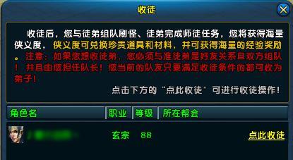1. 师父当队长与徒弟组队杀特定怪物可获得侠义度,带领徒弟数量越多,侠义度越高;
