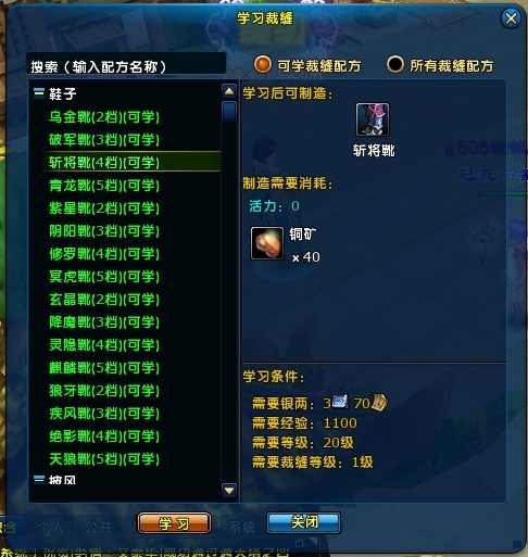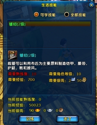 学习条件:角色初生就学会了裁缝技能1级。