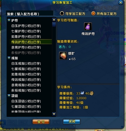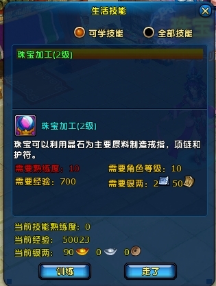 学习条件:角色初生就学会了珠宝加工技能1级。