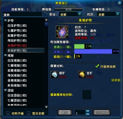 打开珠宝加工的界面,可以查看您的角色的珠宝加工技能的制作状态: