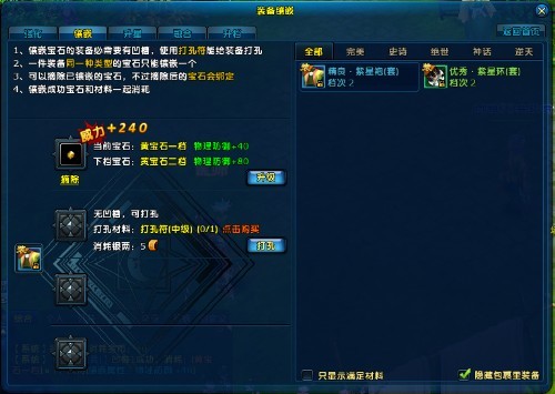 1、宝石镶嵌时必须在装备的对应位置有凹槽,一件装备上最多可拥有4个凹槽。