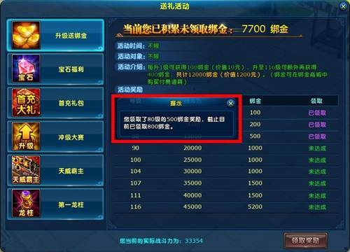 3、玩家可以分别在60级、70级、80级、90级、100级、104级、107级、111级、116级等多个等级段领取绑金。
