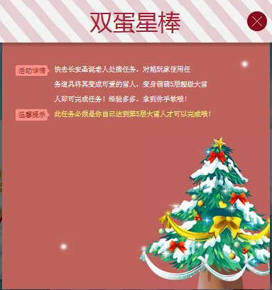 每位玩家可以在圣诞老人处领取任务【双蛋·变身大雪人】,领取后将获得变身道具“圣诞星棒”,“圣诞星棒”对其他玩家使用可以使其变身,必须让其他玩家对自己使用五次任务才可算完成,完成后将获得丰厚奖励。(此任务必须是你自己达到第5层大雪人才可以完成,每个玩家每天可以完成一次)。