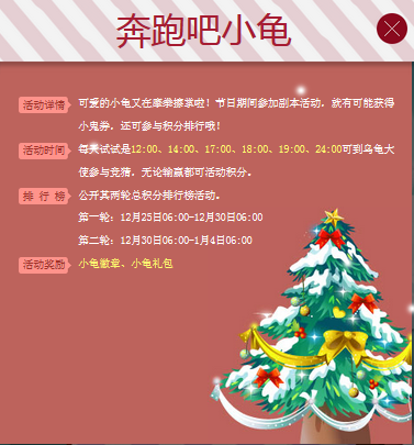 可爱的小龟又在摩拳擦掌啦!双蛋期间玩家通过【太乙幽魂阵】【秦陵探宝】【长白山】【瓦岗寨】等副本可获得【小龟券】,可前往长安NPC【赛龟大使】处参加【奔跑吧小龟】活动获得积分和每日奖励,期间积分总排行榜第一名玩家可获得丰厚奖励