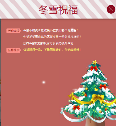 位玩家每天可以在【冬雪祝福】界面领取一份冬雪祝福BUFF,领取后将持续获得大量经验,祝福时间持续两小时。(每人每天只可以领取一次,下线同样计时但无经验)。