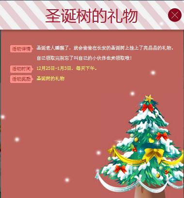 双蛋活动期间每日下午【长安】圣诞树上的礼物就会悄悄浮现,每位玩家每天可以在圣诞树上领取五次礼物,每颗树上礼物领取完一个小时后将会刷新。刷新之前每个玩家在同一棵树上只能领取一次礼物,礼物惊喜多多,祝你好运。