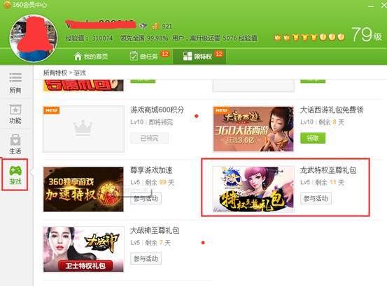 第4步:领取后老用户直接进游戏点360特权领取图标,新用户就进新区体验游戏吧!