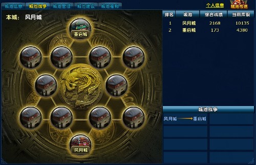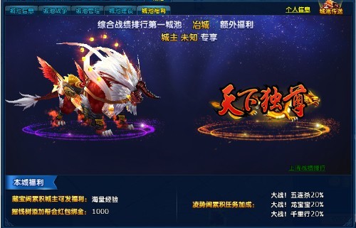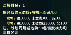 9. 每周一早上六点取城池战绩排行第一的城池内所有成员有额外奖励。