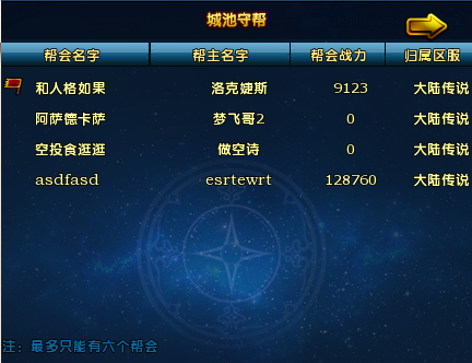 2.城主帮仅可邀请本区(即本大陆)其他帮会加入本城池,1个城池最多容纳6个帮会(包括城主帮)
