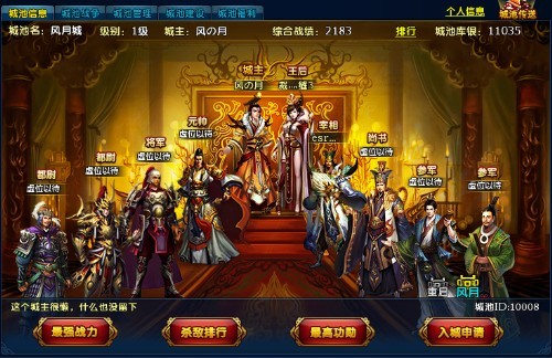 1. 城池信息界面:跨区所有城池官员展示,以及各个城池战力、城池战杀人排行,本周累积功勋排行。
