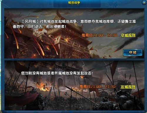 2. 城战时间:城池系统开启以后,每周日21:00-21:30