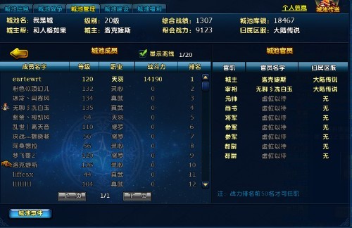 城池管理界面:显示本城池城池成员、城池基本信息、本城池所有官员的名字、城池守帮列表。