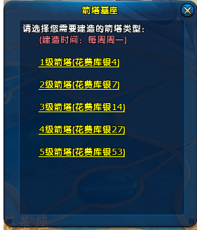 2.箭塔(箭塔基座)总共20个,1~5级箭塔根据城主招募时自行选择,并根据箭塔等级扣除对应的库银。