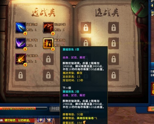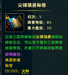 (9)英雄技能 所有英雄的技能都是一样的5个技能,也只有5个技能,提升技能需要英雄技能密卷(尖锋强袭升第三级时需要