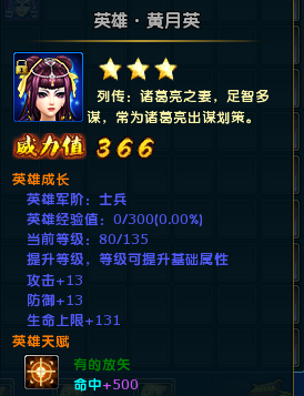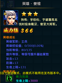 (2)目前只有三种英雄可装备,三星英雄·姜维(天赋:体力充沛 增加生命上限3000),三星英雄黄月英(天赋:有的放矢增