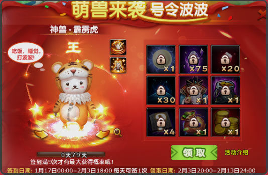 玩家在1月17日-2月3日18:00期间,可登录游戏进行签到,每天签到1次可激活 1个节日礼包,礼包共9个。同时签到还可涨神兽·霹雳 虎的获得概率(此概率非百分之百)