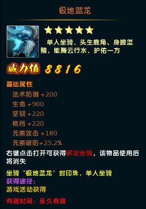 活动期间,每组对立大区中,必然出现一只独一无二的新版绝世神兽·霹雳虎!除了神兽大奖外,还会获得坐骑:极地蓝龙,机会不等人,还不赶快来!