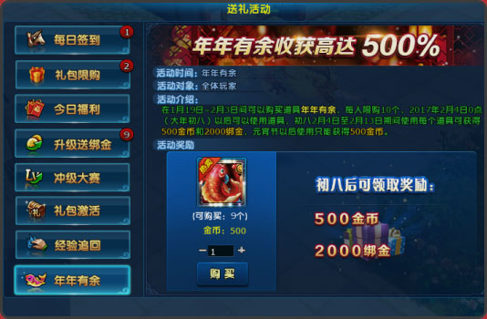在1月19日活动开始后,玩家可点击右上角“礼”,进入送礼活动界面购买 “年年有余”道具,每人限购10个(2月3日23:59后不可购买);