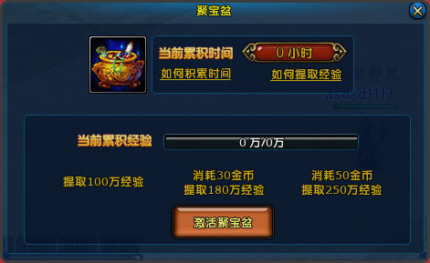 2月4日-2月13日,聚宝盆停止积累时间;玩家可上线兑换经验,有免费兑换和付费兑换两种。花费金币可兑换更多经验。